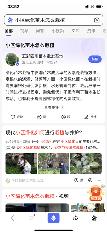 此外,模糊搜索企業頭條關鍵詞,也是可能會在百度首頁展示,比如:綠化工程養護注意、行道樹常用喬木、園林景觀如何設計、小區綠化地被色塊搭配等,搜索仍然首頁展示,全國推廣。