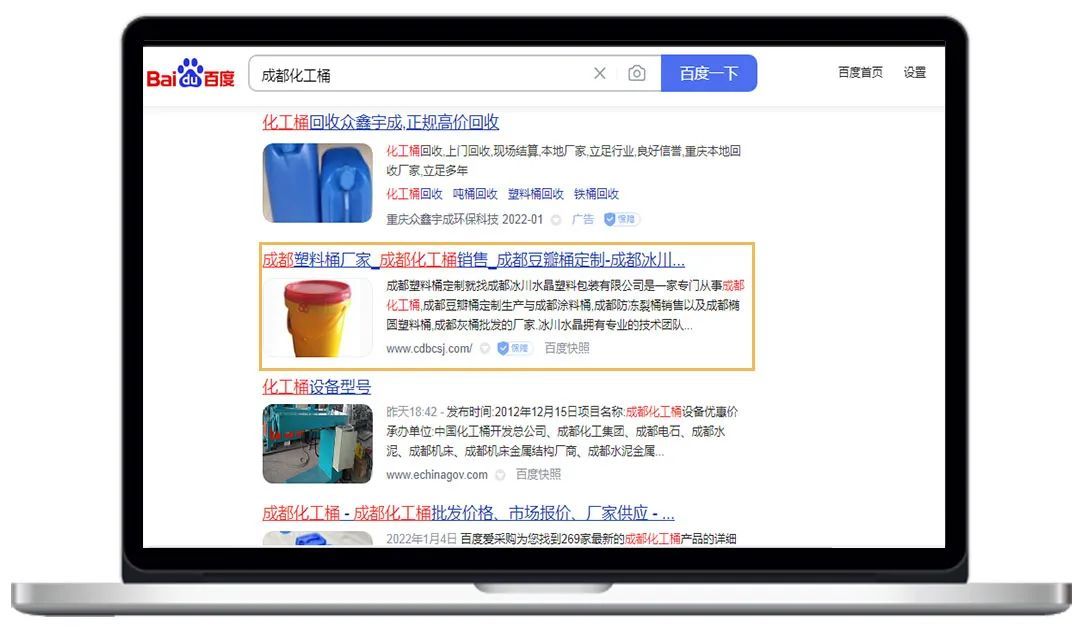 官網優化:成都化工桶、成都豆瓣桶、成都橢圓塑料桶、成都防凍裂桶等關鍵詞,均在百度首頁展現,準確鎖定有需求的客戶。
